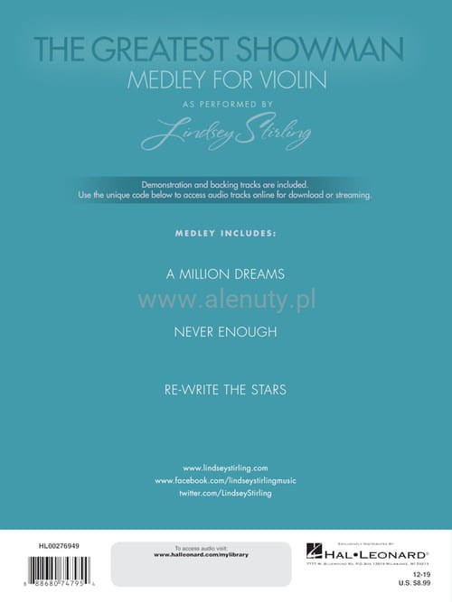 Nuty na skrzypce solo składanki piosenek z musicalu "The Greatest Showman" (Król rozrywki), w aranżacji Lindsey Stirling, skrzypaczki i tancerki, znanej głównie z aranżacji i składanek publikowanych na YouTube. W cenie nut jest dostęp do nagrań utworów i podkładów muzycznych na stronie wydawcy.