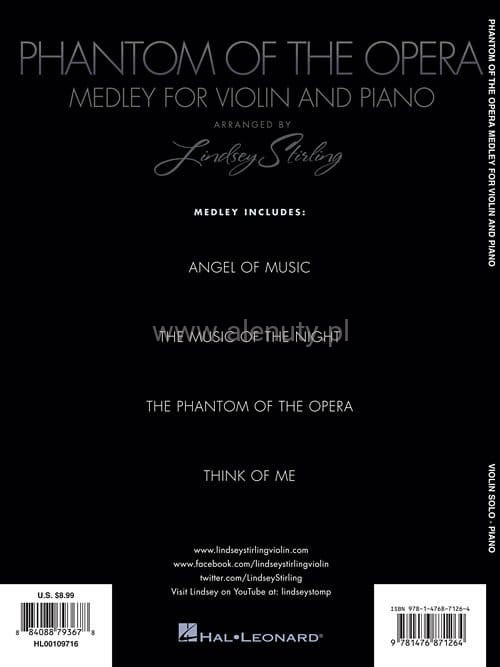Nuty na skrzypce z fortepianem wybranych utworów z musicalu 'The Phantom Of The Opera' (Upiór w operze), w aranżacji, którą wykonywała Lindsey Stirling.