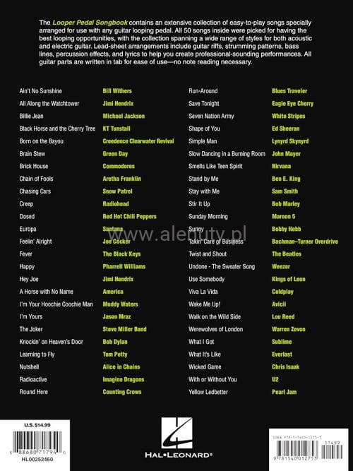 Nuty na gitarę elektryczną (tabulatura) 50 popularnych piosenek do zagrania z wykorzystaniem efektu looper. Utwory zostały specjalnie, aby dobrze nadawały się do zastosowania loopera i nie wymagały zbyt dużych umiejętności gry na gitarze.