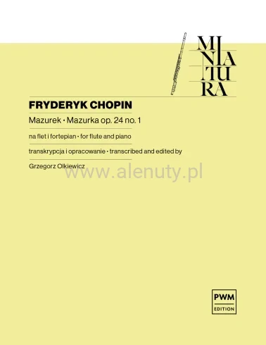Pozycja z serii 'Miniatury fletowe' zawiera utwór Fryderyka Chopina 'Mazurek op. 24 nr 1' w opracowaniu Grzegorza Olkiewicza na flet i fortepian.