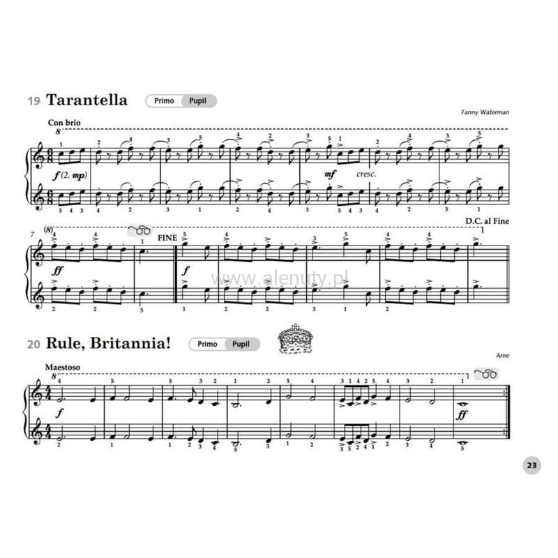 Łatwe, atrakcyjne duety opracowane w celu uzupełnienia książek Me and My Piano 1 i 2. Utwory w tej kolekcji mają różne stopnie trudności, dzięki czemu młody pianista może grać razem z nauczycielem, rodzicem lub innym uczniem. To żywa i stymulująca mieszanka nowych i znanych utworów, pochodzących z wielu różnych krajów. Nuty na duety fortepianowe, dla początkujących.