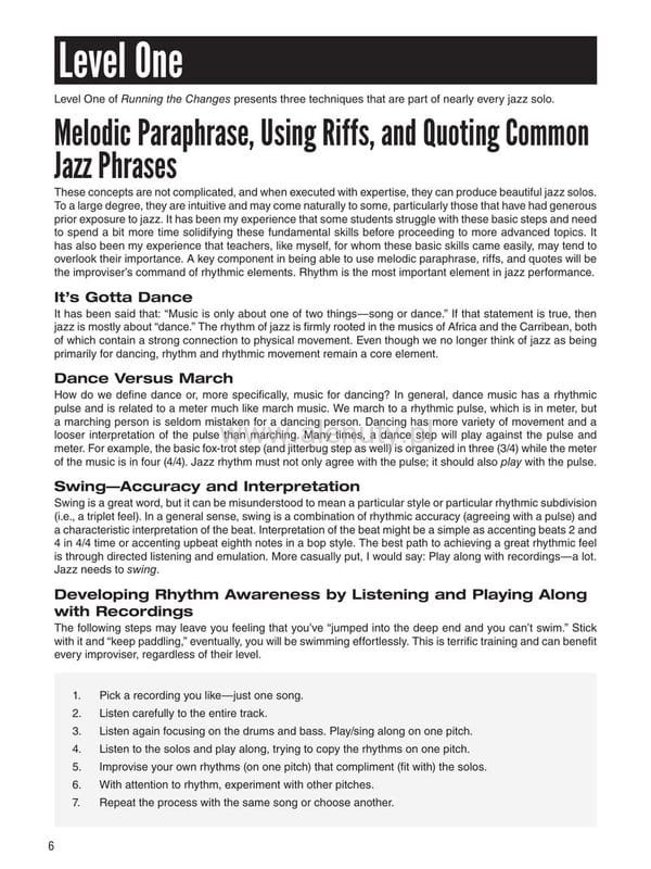 Publikacja zawiera informację dotyczące podstaw improwizacji jazzowej. Książka zapewnia zwięzłe i dokładne wytłumaczenie wszystkich zagadnień, niezależnie od instrumentu. Omawiane tematy obejmują: Parafrazę melodyczną, riffy, podstawową teoria akordów, zaawansowane solówki, budowę skal pentatonicznych i heksatonicznych, historię i praktykę jazzu i wiele więcej.