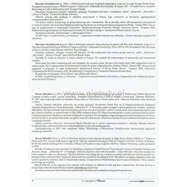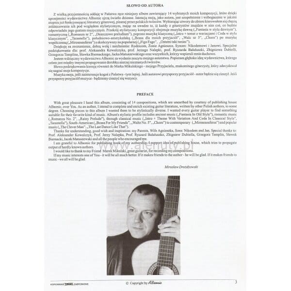 Zbiór zawiera 14 utworów na gitarę zróżnicowanych pod względem stylistycznym, obejmuje muzykę dawną, romantyczną, klasyczną, południowo-amerykańską aż po współczesną i popularną.