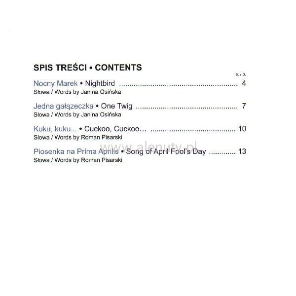 Publikacja zawiera cztery utwory z serii dziecięcej Witolda Lutosławskiego, skomponowane do słów Janiny Osińskiej i Romana Pisarskiego, w opracowaniu na głos i fortepian, dla początkujących. Do nut dołączony został akompaniament nagrany na płycie CD.