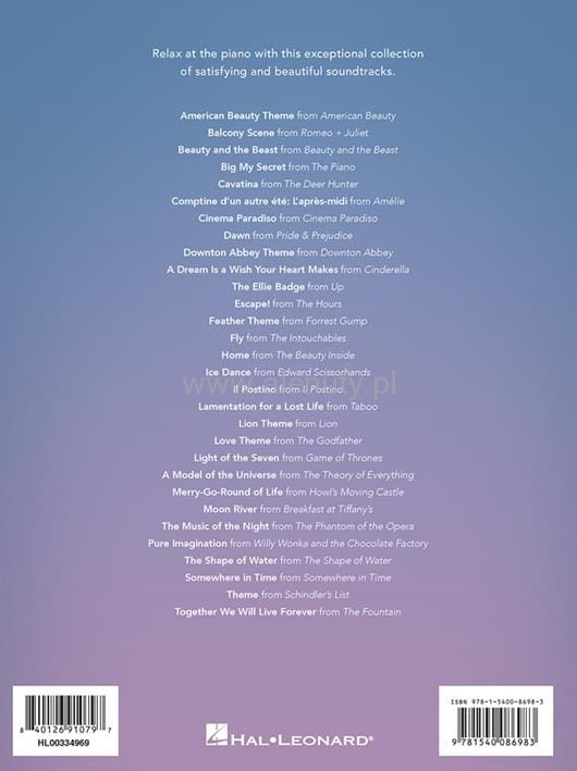 Zrelaksuj się przy pianinie dzięki tej wyjątkowej kolekcji satysfakcjonujących i pięknych ścieżek dźwiękowych. Zawiera utwory z klasyki filmowej: Ojca chrzestnego, Gry o tron, Amélie i wielu innych. Aranżacja na fortepian dla średnio-zaawansowanych.