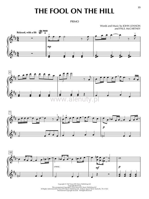 The Beatles to największa legenda rocka, zespół, który zawojował listy przebojów na całym świecie, napisał setki hitów, do dziś inspiruje i zachwyca, a jego płyty wciąż znikają z półek. Publikacja zawiera 10 świetnych utworów wykonywanych przez grupę The Beatles, skomponowanych przez ikony zespołu Johna Lennona i Paula McCartney'a. John Lennon brytyjski muzyk, kompozytor i piosenkarz, który w 1965 roku otrzymał z rąk królowej Elżbiety II Order Imperium Brytyjskiego. W 1994 roku John Lennon został wprowadzony do Rock and Roll Hall of Fame. W 2002 roku w plebiscycie BBC na „100 najważniejszych Brytyjczyków wszech czasów” nazwisko Lennona znalazło się w pierwszej na liście 100 najważniejszych Brytyjczyków wszech czasów. Pełnił przez większą część historii zespołu rolę lidera The Beatles. Wspólnie z Paulem McCartneyem stworzył znaczącą większość repertuaru Beatlesów i najsłynniejszy duet pisarsko-kompozytorski Lennon/McCartney. Paul McCartney – brytyjski kompozytor muzyki filmowej, poważnej i elektronicznej, multiinstrumentalista i piosenkarz, kawaler Orderu Imperium Brytyjskiego. Napisana przez niego piosenka „Yesterday” jest najczęściej granym przez innych artystów utworem w historii, a także najczęściej graną piosenką w amerykańskich mediach. Wpisany w Księdze Rekordów Guinnessa jako muzyk, który osiągnął największy sukces w historii muzyki. Ten niezwykły duet muzyków to jeden z najbardziej znanych i owocnych przykładów współpracy w historii muzyki rozrywkowej. Wspólnie napisali około 180 piosenek, które w przeważającej większości zostały nagrane przez zespół The Beatles i stanowiły główną pozycję w jego dyskografii. Książka zawiera opracowanie na fortepian na cztery ręce. Do książki dołączony jest kod Audio Online do plików zawierających utwory demo i podkłady. Nuty dla średnio-zaawansowanych.