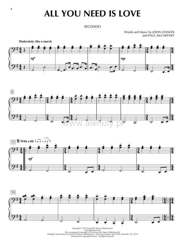 The Beatles to największa legenda rocka, zespół, który zawojował listy przebojów na całym świecie, napisał setki hitów, do dziś inspiruje i zachwyca, a jego płyty wciąż znikają z półek. Wszystko zaczęło się w Liverpoolu kiedy w marcu 1957 roku John Lennon założył zespół The Quarrymen, nazwany tak od jego szkoły, Quarry Bank High School. Skład zespołu zmieniał się często, ale już w lutym 1958 roku w formacji grali także: Paul McCartney, George Harrison i perkusista Colin Hanton. W styczniu 1960 roku do grupy dołączył basista Stuart Sutcliffe, który zasugerował nazwę The Beetles jako odpowiedź na The Crickets Buddy'ego Holly. Wiosną nazywali się jeszcze The Silver Beatles, a w maju po raz pierwszy pojawiło się logo The Beatles. Grupa działała do 1970 roku. Przez zaledwie 10 lat nagrała 12 albumów studyjnych, w 1956 roku otrzymała od królowej Ordery Imperium Brytyjskiego. Publikacja zawiera 10 świetnych aranżacji w duecie fortepianowym opracowanym na 4 ręce klasyków grupy The Beatles. Do książki dołączony jest kod Audio Online z dostępem do plików zawierających utwory demo i podkłady. Nuty dla średnio-zaawansowanych.