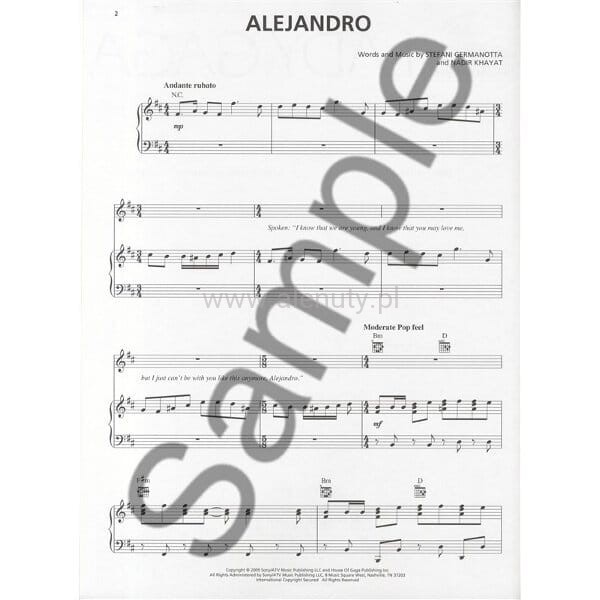 8 utworów w dorobku Lady Gagi w aranżacji na pianino, gitarę i wokal. Książka opracowana w taki sposób, by jednocześnie mógł z niej korzystać zarówno gitarzysta, pianista jak i solista. Na stronie znajdują się nuty dla fortepianu i wokalu a powyżej zapisu nutowego umieszczone są akordy gitarowe wraz z diagramami. Każdy z utworów jest opracowany na fortepian, gitarę i wokal. Książka jest publikacją zagraniczną (anglojęzyczną), ale nie wymaga szczególnej znajomości języka angielskiego. Wstęp w języku angielskim.