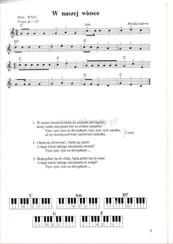 Kolekcja 29 piosenek dla dzieci opracowanych na fortepian lub keyboard w formie: linia melodyczna (klucz wiolinowy), pełen tekst, funkcje harmoniczne oraz diagramy akordów pokazujące układ palców na klawiaturze.