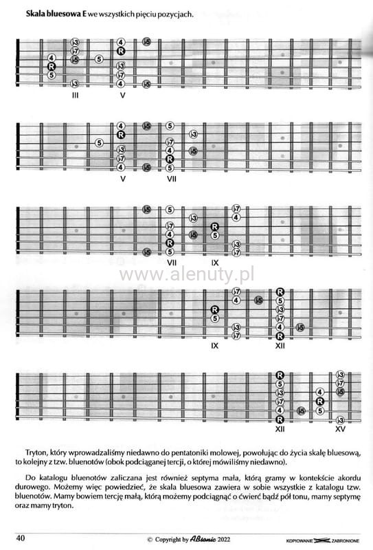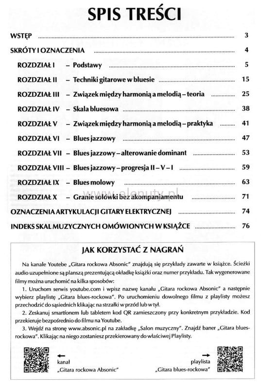 Wg autora książki - każdy gitarzysta powinien rozpocząć swoją przygodę z gitarą i muzyką improwizowaną właśnie od bluesa. Blues jest znakomitym nauczycielem frazowania, techniki podciągania strun i wszystkiego, co określilibyśmy mianem feelingu. Książka adresowana jest do muzyków, którzy zrobili już pierwszy krok, znają podstawy a teraz mają ambicję podjąć dogłębnie, zaawansowaną szkołę gry na gitarze elektrycznej i pracę nad improwizacją bluesową.