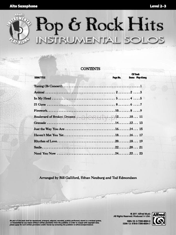 Publikacja zawiera hity pop i rock. Nuty na saksofon altowy z fortepianem, dla początkujących. Do książki dołączona jest płyta CD z plikami audio lub MP3. Znajdziesz na niej podkłady do zagrania partii solowej bez akompaniatora lub będziesz mógł odsłuchać ścieżki demo każdego utworu.