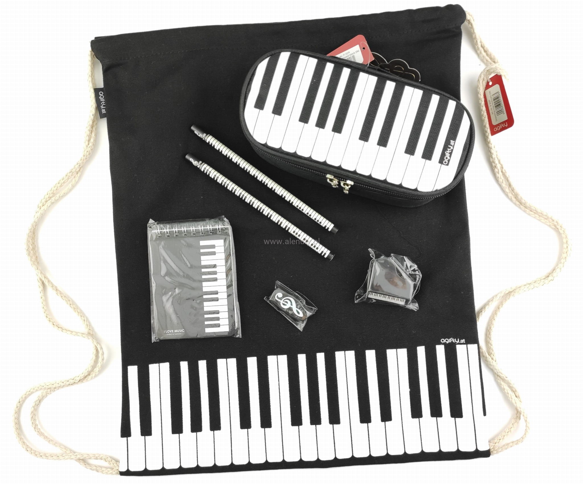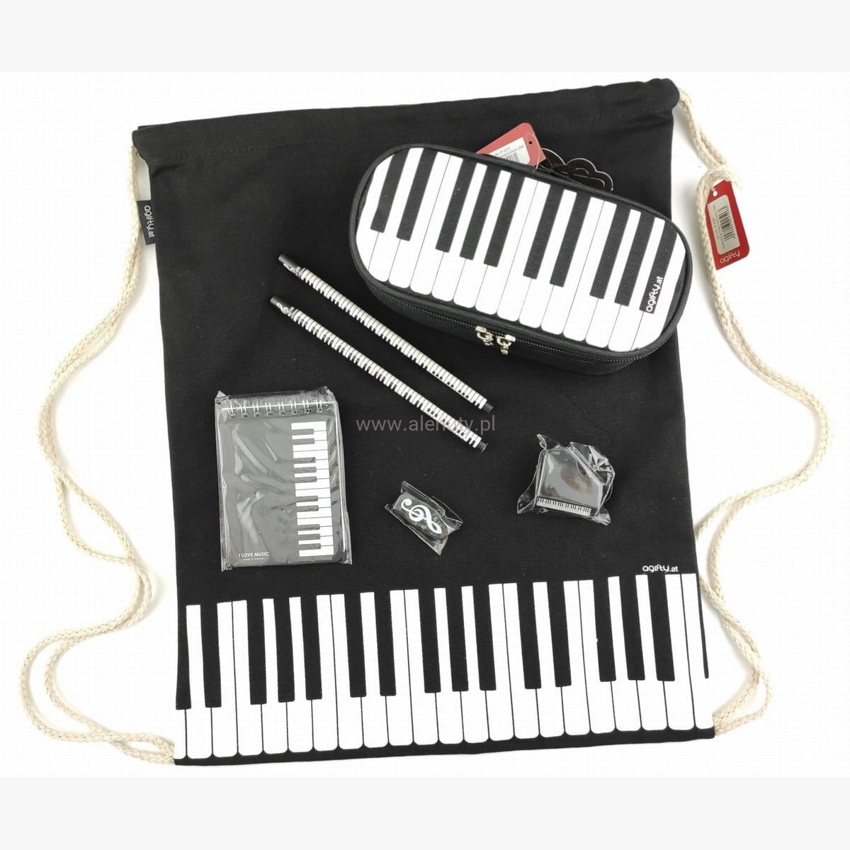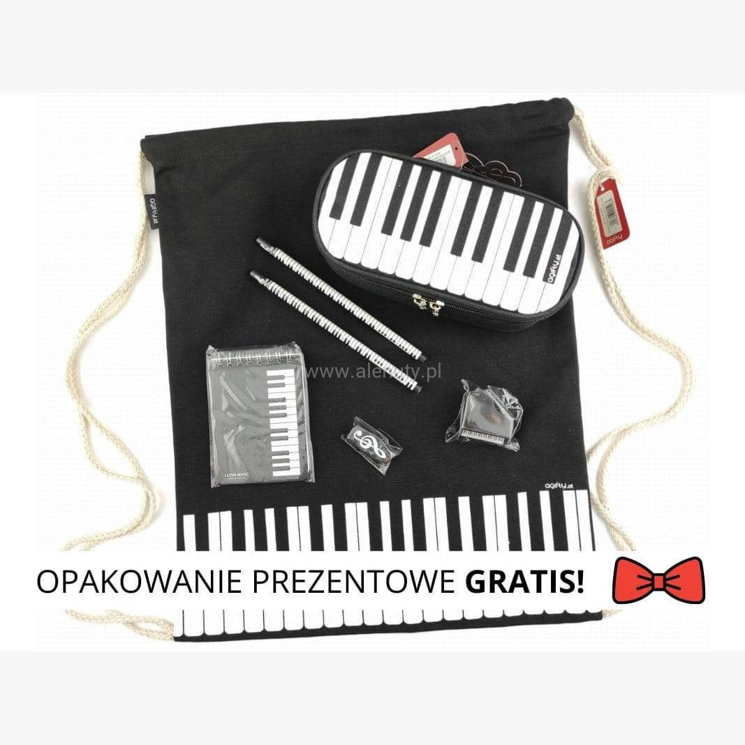 A do takich na pewno należy worek-plecak z czarnego grubego płótna z klawiaturą fortepianu. Wytrzymały materiał i niebrudzący kolor pozwalają używać worka na co dzień. Do worka wrzucamy piękny piórnik również z klawiaturą fortepianu. Piórnik zamykany jest na zamek, którego zapięcia to metalowe miniaturkowe klucze wiolinowe. Dołączyliśmy tu także zestaw ołówków z linijką i temperówką oraz małym notatnikiem. A całość zapakujemy w piękne opakowanie prezentowe wykończone wstążeczką. I prezent muzyczny gotowy!