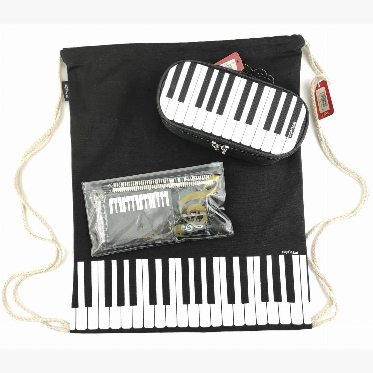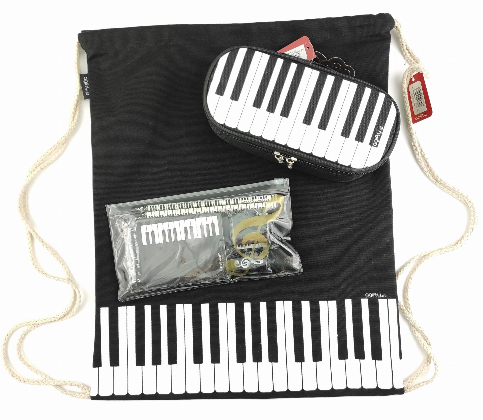 Prześliczny zestaw, piórnik jest uroczy!!! córka jest zachwycona. Worek z mocnego materiału, udźwignie kilka książek. Bardzo ładnie zapakowane. Polecam jeśli ktoś szuka na prezent dla młodego muzyka :)