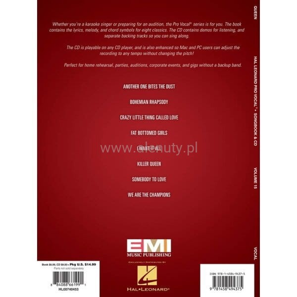 Nieważne czy chcesz pośpiewać w domu karaoke czy przygotowujesz się do przesłuchania, seria Pro Vocal jest dla wszystkich, którzy kochają śpiewać! Książka zawiera teksty, linię melodyczną i akordy do 8 najbardziej znanych utworów Queen. Do książki dołączona jest płyta CD z plikami audio lub MP3. Znajdziesz na niej demo do posłuchania oraz ścieżki dźwiękowe jako podkład do śpiewania. Jest to wspaniały materiał na próby, nagrania, imprezy firmowe czy domowe bez zespołu.