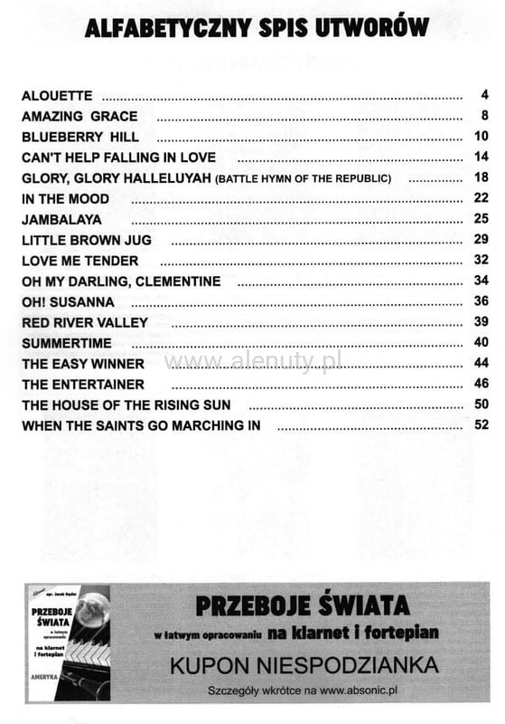 Publikacja zawiera najpopularniejsze utwory stworzone w takich stylach, jak: country, western folk, gospel, jazz, swing, blues, ragtime, boogie-woogie, rock. Nuty na klarnet i fortepian dla początkujących.