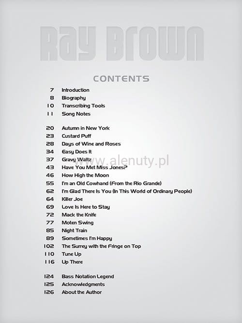 Pozycja z serii 'Artist Transcriptions' zawiera kolekcję 18 najpopularniejszych utworów legendarnego amerykańskiego kontrabasisty jazzowego - Ray'a Brown na kontrabas, w transkrypcji Matthew Rybickiego.