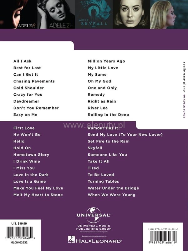 Ten śpiewnik zawiera 40 ulubionych piosenek Adele, opracowanych na łatwym poziomie. Książka zawiera nuty i wskazówki dotyczące wykonania.