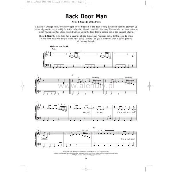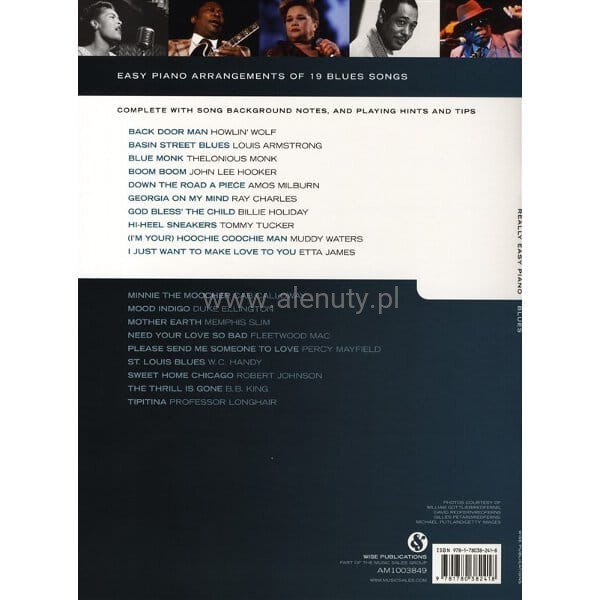 Pozycja z serii "Really Easy Piano" dla początkujących pianistów. W tym wydaniu 19 ulubionych i najbardziej znanych piosenek bluesowych. Każda piosenka w łatwym zapisie nutowym wraz z akordami. Książka zawiera wskazówki i porady, które pomogą doskonalić grę.