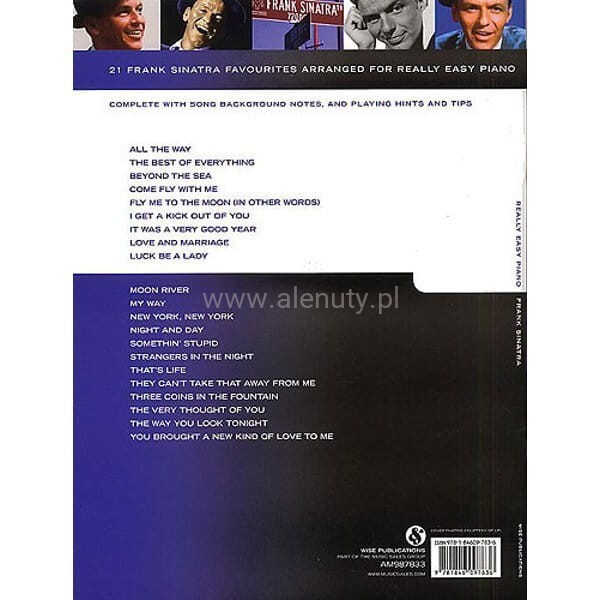 Pozycja z serii "Really Easy Piano" - w łatwym układzie na fortepian, jest pozycją, którą każdy powinien mieć w swojej kolekcji. Zawiera ona 21 klasycznych piosenek Franka Sinatry, między innymi Fly Me To The Moon, New York, New York , The Way You Look Tonight i wiele innych. Opracowanie każdej piosenki zawiera zapis nutowy, akordy oraz pełen tekst.