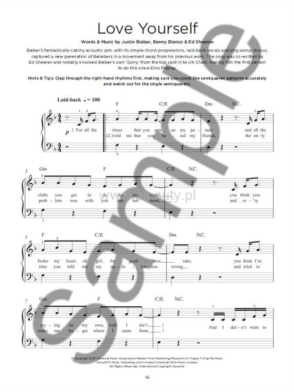 Pozycja z serii "Really Easy Piano" - w łatwym układzie na fortepian, jest pozycją, którą każdy powinien mieć w swojej kolekcji. Zawiera ona 16 najbardziej popularnych piosenek Justina Biebera, między innymi: Baby, One Time, Sorry i wiele innych. Opracowanie każdej piosenki zawiera zapis nutowy, akordy oraz pełen tekst.