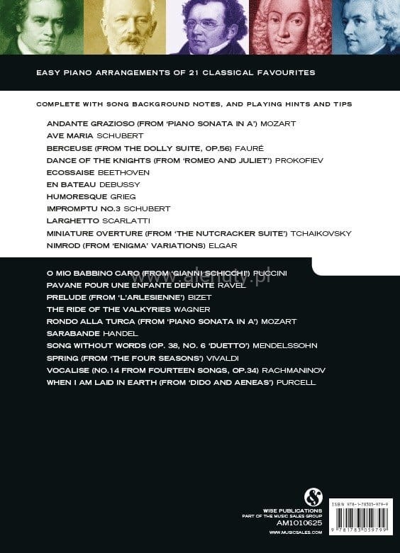 Pozycja z serii "Really Easy Piano" - w łatwym opracowaniu nutowym na fortepian, jest pozycją, którą każdy powinien mieć w swojej kolekcji. To wydanie zawiera 21 najznakomitszych utworów klasycznych.