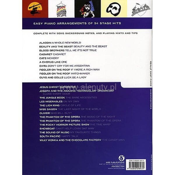 Pozycja z serii "Really Easy Piano" - w łatwym układzie na fortepian, jest pozycją, którą każdy powinien mieć w swojej kolekcji. Zawiera ona 24 uwielbiane przez tłumy szlagiery, między innymi z takich filmów i musicali, jak: Nędznicy, Jesus Christ Supersta, Skrzypek na dachu, Piękna i Bestia i wielu innych. Opracowanie każdej piosenki zawiera zapis nutowy, akordy oraz pełen tekst.