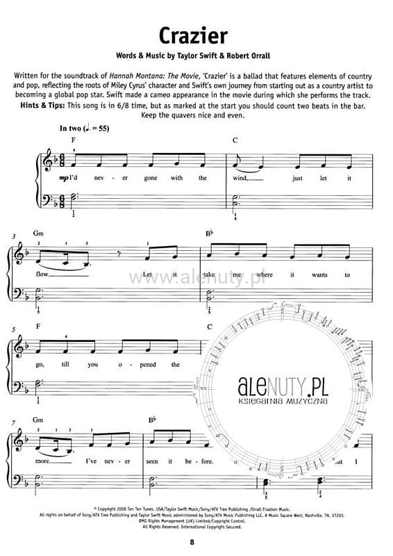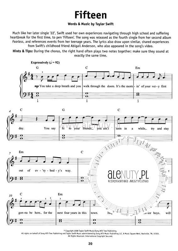 Pozycja z serii "Really Easy Piano" - w łatwym układzie na fortepian, jest pozycją, którą każdy powinien mieć w swojej kolekcji. Zawiera ona 18 największych przebojów amerykańskiej gwiazdki Taylor Swift, między innymi: Love Story, Everything Has Changed, Teardrops On My Guitar, Everything Has Changed i wiele innych. Opracowanie każdej piosenki zawiera zapis nutowy, akordy oraz pełen tekst.