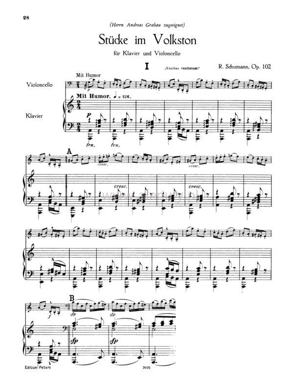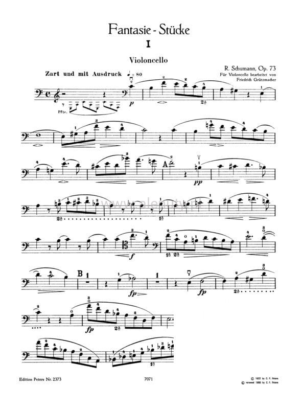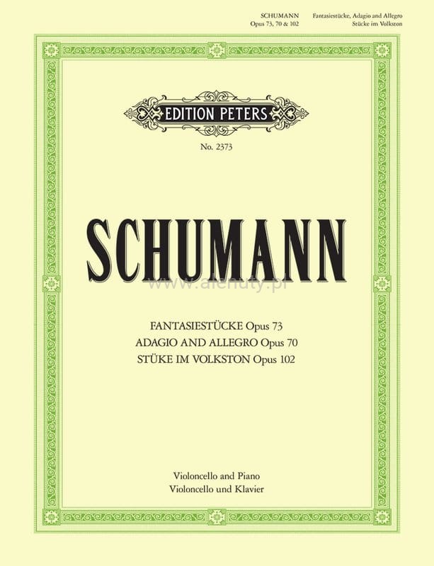 Nuty na wiolonczelę z fortepianem 'Fantasiestücke' (Utwory fantastyczne) op. 73, 'Adagio und Allegro' op. 70 oraz 'Fünf Stücke im Volkston' (Pięć utworów w ludowym stylu) op. 102. Opracowania dokonał Friedrich Grützmacher.