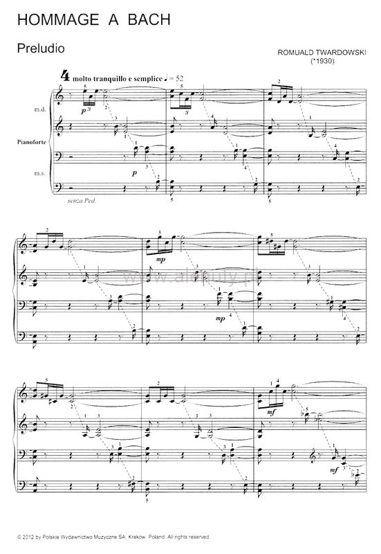 Hommage a Bach jest hołdem muzycznym złożonego przez współczesnego kompozytora wielkiemu kantorowi z Lipska na 250-lecie jego śmierci. To jego bowiem muzyka pozwoliła autorowi tych słów jeszcze w zaraniu jego drogi twórczej na zgłębienie sensu i istoty fenomenu muzyki jako najdoskonalszej emanacji Harmonii i Piękna znajdującej swój wyraz w doskonałości formy, mistrzostwie warsztatu i głębi wypowiedzi. We wszystkich pięciu ogniwach cyklu przejawia się stale powracająca bachowska nuta rozpoznajemy ją w licznych recytatywach, szybkich biegnikach i figuracjach, a także reminiscencjach, jak to ma miejsce np. w końcowej Toccacie. Łączy je ta sama myśl dążenie do syntezy tradycji i nowoczesności jako wyrazu uznania prymatu EWOLUCJI w sztuce nad REWOLUCJĄ, synonimem pozornego postępu i źródła destrukcji. Nuty na fortepian, dla średnio-zaawansowanych.