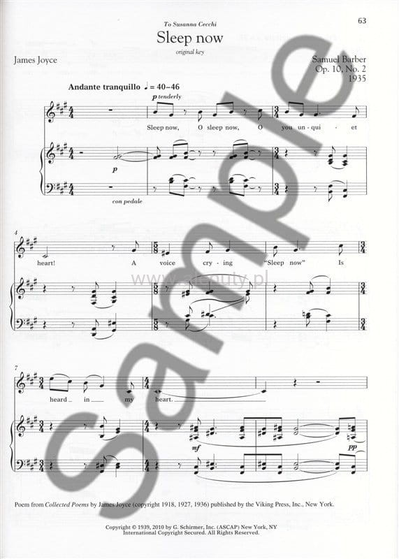 Kolekcja pieśni artystycznych Samuela Barbera - jednego z najsławniejszych amerykańskich kompozytorów XX wieku, twórcy muzyki orkiestrowej, operowej, chóralnej i fortepianowej, w opracowaniu na głos średni lub niski i fortepian.