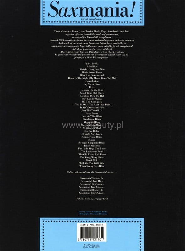 Pozycja z serii 'Saxmania!' zawiera niesamowicie bogatą kolekcję utworów bluesowych w opracowaniu na wszystkie typy saksofonów - sopranowy, altowy, tenorowy i barytonowy. Dodatkowo opracowanie zawiera również symbole akordów.
