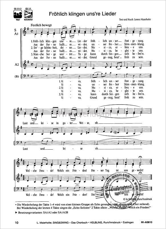 Fröhlich klingen uns’re Lieder ■ Let’ s Joyfully Raise Our Voices / Wir feiern ein Fest der Freude ■ Swing the 'Prélude' ■ European Hello-Round XV ■ European Hello-Round X ■ Freude schöner Götterfunken ■ Wer sich die Musik erkiest ■ Viele verachten die edle Musik ■ Musica aeterna ■ Intrada a cappella ■ Drei schöne Dinge fein ■ Singen ■ A Song is Like an Apple ■ There Was a Young Woman of Ryde ■ Music is Number One ■ Java Jive ■ Sing and Swing ■ Oh, What a Day ■ Let’s Swing ■ Fröhlich sein ■ Alles, alles Gute / Happy, happy Birthday ■ Doo Dub Dah ■ S(w)ingin’ ■ Have a Nice Day ■ Mah-na-mah-na ■ lächerlich / ridiculous ■ Ha ha ha ■ Beat Street ■ Call & Response-Blues ■ Something Deep Tells Me to Sing ■ The Vocal Washing Machine ■ Rock for Fun ■ The Flintstones ■ A Round of Tree / Country Dances in One ■ Bojeje ■ Tanzlied ■ Tanzlied mit dem Luftballon ■ Talking Faces ■ Clap, Snap ■ Pythagoräischer Lehrsatz ■ Was gibt’s News / What’s up