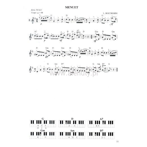 Zapis zawiera akordy, oznaczenia palcowania oraz schematy klawiatur z pokazanymi akordami.