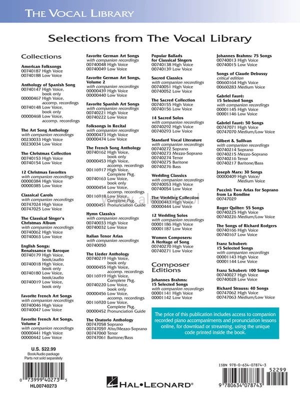 Publikacja należy do serii składającej się z pięciu publikacji zawierających nuty do piosenek artystycznych. Każda książka ma inną listę utworów. Poza piosenkami artystycznymi, każda kolekcja zawiera dwie starannie dobrane arie operowe, arię oratoryjną i arię operetkową autorstwa Gilberta i Sullivana. Wewnątrz książki znajduje się kod dostępu do plików audio online, które można przesyłać strumieniowo lub pobierać. Pliki audio obejmują funkcję PLAYBACK+, to wielofunkcyjny odtwarzacz audio, który umożliwia odsłuchanie utworów demo, spowolnienie dźwięku bez zmiany wysokości, ustawiania punktów pętli, zmiany klawiszy i balans dźwięku stereo. Nuty na głos żeński mezzosopran z fortepianem, dla średnio-zaawansowanych.