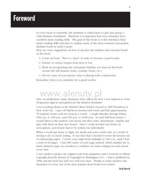 'Progressive Steps To Syncopation for Modern Drummer' Teda Reeda to jedna z najbardziej wszechstronnych i praktycznych prac dotyczących gry na perkusji, jakie zostały kiedykolwiek napisane. Głównymi elementami, na których skupia się autor to synkopy oraz umiejętność czytania nut.