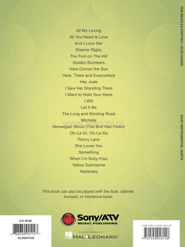 Legenda muzyki rozrywkowej - Wielka Czwórka z Liverpoolu. Takim mianem określany jest brytyjski zespół The Beatles w którego składzie występowali – John Lennon, Paul McCartney, George Harrison i Ringo Starr. Grupa powstała w Liverpoolu w 1960 roku. Początkowo grali rocka and rolla. Z czasem poszerzyli swoje brzmienie o melodyjny pop i folk. Jak na owe czasy stosowali innowacyjne tricki dźwiękowe w studiu. Używali podwójnego nagrywania oraz zmiennych prędkości. Stawali też nieszablonowe instrumenty w ówczesnej muzyce rockowej jak np. mellotron, a na scenie jedynie małych wzmacniaczy Vox. Stali się pionierami nowoczesnych form art rocka poprzez rozbudowanie instrumentarium o kwartet smyczkowy. W historii amerykańskiego przemysłu fonograficznego sprzedali więcej płyt, niż jakikolwiek inny zespół. Istnieli na rynku muzycznym tylko dziesięć lat a sprzedali ponad 600 milionów egzemplarzy płyt. Ta kolekcja zawiera 23 znane i popularne utwory tej grupy w łatwych aranżacjach dla dwóch instrumentalistów. Nuty na saksofon altowy dla poczatkujących.