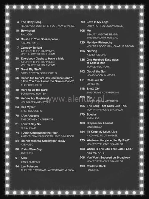 Nuty na fortepian, głos i gitarę (PVG) 30 wybranych najpopularniejszych piosenek humorystycznych z Broadway'u. Wydania oznaczone jako PVG (Piano Vocal Guitar - Fortepian Melodia Gitara) zawierają zapis nutowy linii melodycznej, nuty na fortepian, akordy gitarowe oraz słowa do piosenek zamieszczonych w publikacji. Więcej o nutach PVG przeczytasz >>> w artykule