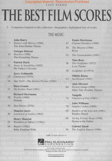 Nuty na fortepian 23 popularnych dzieł muzyki filmowej w prostym opracowaniu na fortepian, umożliwiającym ich wykonanie początkującym pianistom.