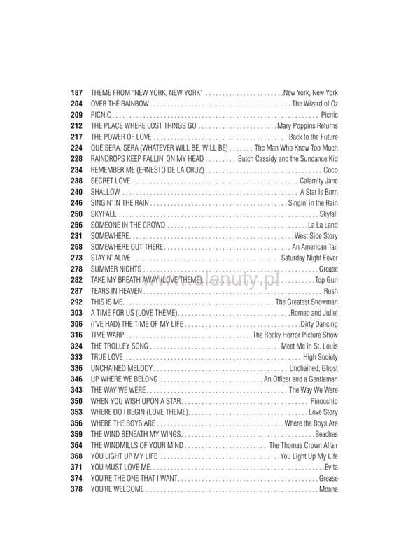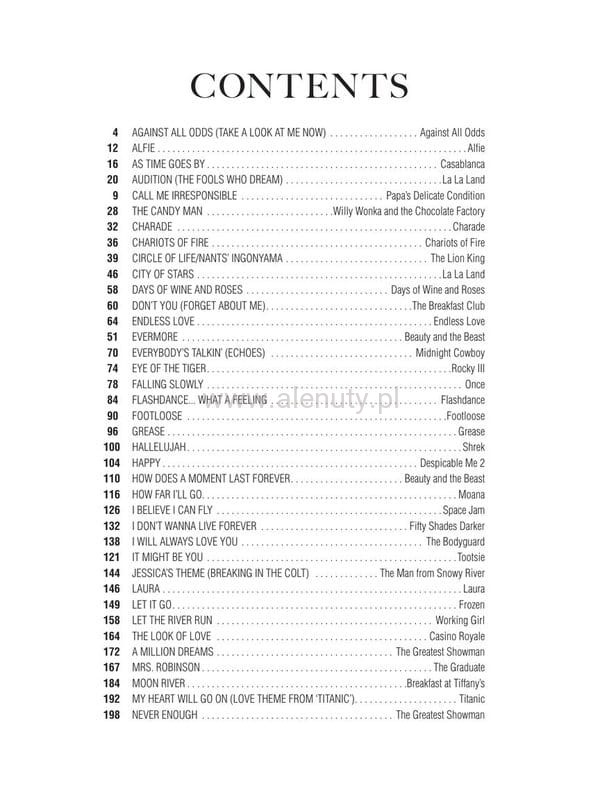 Fantastyczny zbiór 76 ulubionych piosenek z najbardziej pamiętnych filmów wszechczasów. Opracowanie na fortepian, gitarę i głos. Zawiera nuty dla początkujących. Wydania oznaczone jako PVG (Piano Vocal Guitar - Fortepian Melodia Gitara) zawierają zapis nutowy linii melodycznej, nuty na fortepian, akordy gitarowe oraz słowa do piosenek zamieszczonych w publikacji. Więcej o nutach PVG przeczytasz >>> w artykule