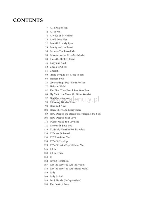 Wspaniała kolekcja 82 romantycznych utworów w różnych stylach muzycznych, zaaranżowanych na fortepian, gitarę i wokal. Wydania oznaczone jako PVG (Piano Vocal Guitar - Fortepian Melodia Gitara) zawierają zapis nutowy linii melodycznej, nuty na fortepian, akordy gitarowe oraz słowa do piosenek zamieszczonych w publikacji. Więcej o nutach PVG przeczytasz >>> w artykule