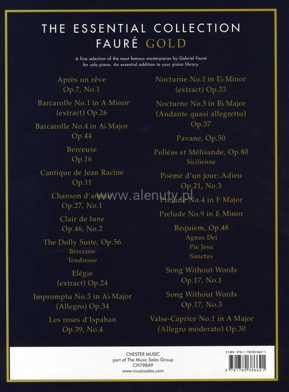 Pozycja z serii 'Essential Collection: Gold' zawiera kolekcję największych i najpopularniejszych dzieł Gabriela Fauré w opracowaniu na fortepian solo. Do książki dołączona jest płyta CD z wysokiej jakości wersjami demonstracyjnymi utworów.