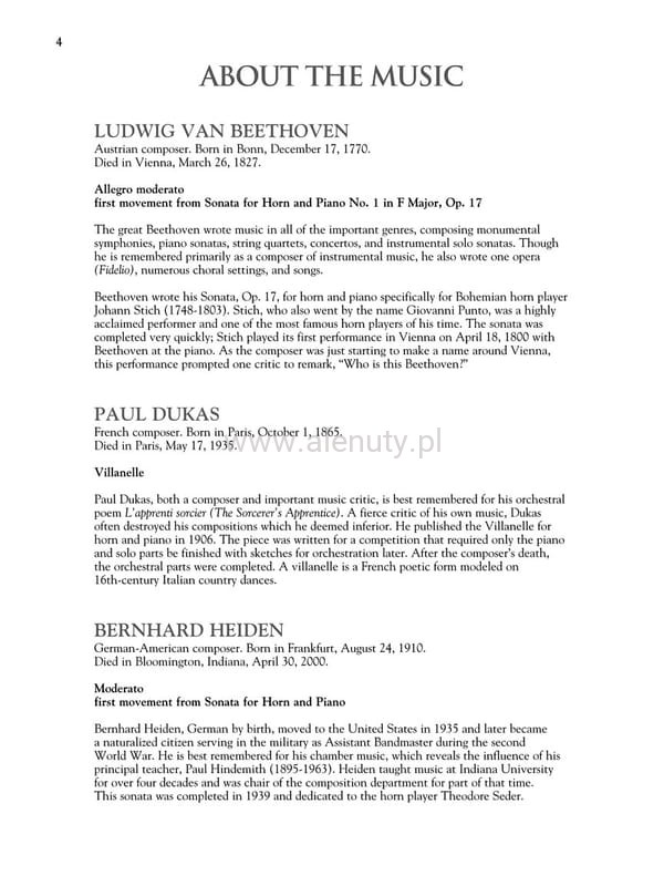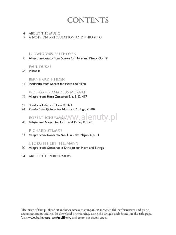 Publikacja mieści w sobie kolekcję utworów zebranych przez G. Schirmera w opracowaniu na waltornię (róg) z akompaniamentem fortepianu. Kompozycje stopniem trudności odpowiadają średnio zaawansowanym i zaawansowanym licealistom oraz studentom. Literatura jest uporządkowana według stopnia trudności, z historycznymi informacjami o każdym utworze. Ponadto publikacja zawiera specjalny kod do dodatkowych materiałów muzycznych dostępnych online, gdzie znajdziesz piękne nagrania wszystkich utworów, oraz akompaniamenty fortepianowe.