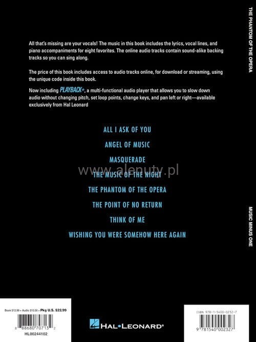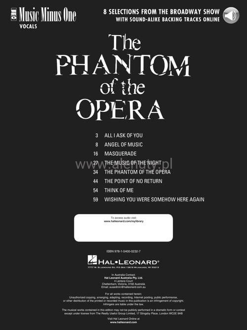 Nuty na głos z fortepianem zbioru 8 piosenek ze sławnego musicalu 'The Phantom of the Opera' (Upiór w operze), których autorem jest Andrew Lloyd Webber. W cenie książki są nagrania utworów dostępne do pobrania ze strony wydawcy.