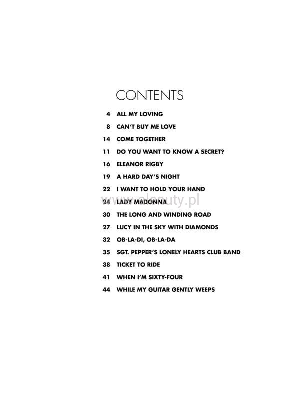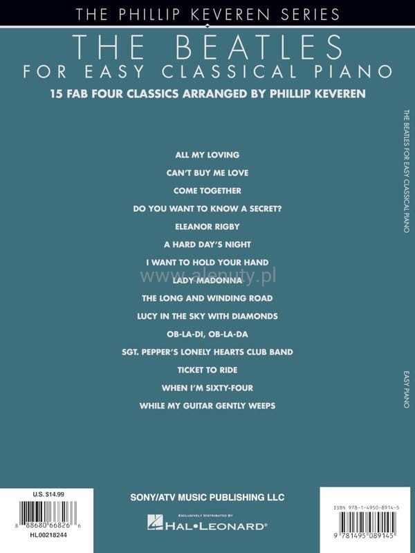The Beatles - kultowy zespół rockowy z Liverpoolu, w którego skład wchodzili John Lennon, Paul McCartney, George Harrison i Ringo Starr. Mimo że grupa istniała jedynie przez około 10 lat, jest jednym z najbardziej znanych zespołów na świecie, którego stylu muzycznego nie da się pomylić z nikim innym. Ma na koncie najwięcej sprzedanych płyt w historii. Publikacja zawiera 15 popularnych piosenek tej grupy, które zostały po mistrzowsku zaprezentowane w klasycznym stylu na fortepian przez Phillipa Keverena. Nuty na fortepia specjalnie opracowane dla uczniów szkół muzycznych w początkowych latach ich nauki.