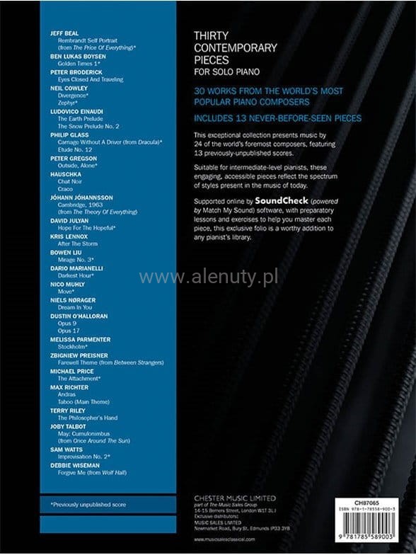 Nuty na fortepian 30 utworów współczesnych reprezentujących różną stylistykę, autorstwa 24 kompozytorów, w tym 13 wcześniej nie opublokowanych pozycji. Pod względem poziomu trudności, utwory te są odpowiednie la średnio-zaawansowanych pianistów, mających już pewne doświadczenie z instrumentem. Zbiór jest wspierany przez SoundCheck, co zapewnia dodatkowe ćwiczenia online, mające pomóc w opanowaniu tych utworów.