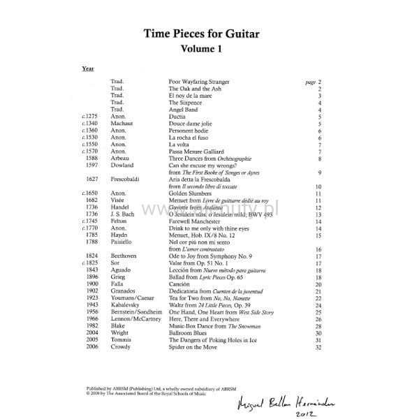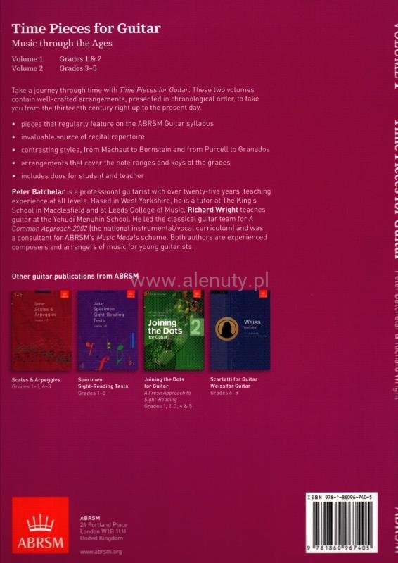Pozycja z serii "Time Pieces", to kolekcja 36 utworów zaaranżowanych na gitarę solo i w duecie. Prezentowana pozycja stanowi część 1 i obejmuje dzieła z okresu od XIII wieku do czasów współczesnych. Wszystkie utwory w łatwym zapisie nutowym opracowane przez Petera Batchelara i Richarda Wrighta.