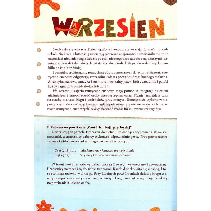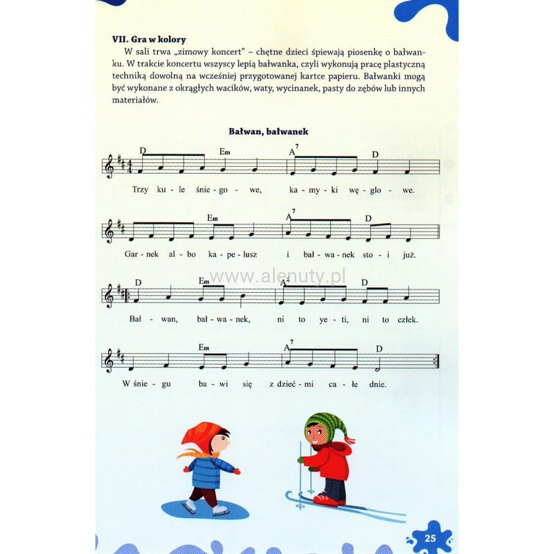 Pozycja "Gra w kolory" to bardzo ciekawy zbiór piosenek i zabaw opracowanych na każdy miesiąc roku szkolnego, które można wykorzystać dla urozmaicenia zajęć w przedszkolu czy szkole, a także w domu.
