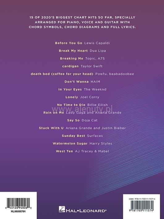 15 z największych przebojów 2020 roku, specjalnie zaaranżowanych na fortepian, głos i gitarę. Zawiera przeboje Lewisa Capaldiego, Dua Lipy, Taylor Swift, Harry Styles i wielu innych. Aranżacja zawiera nuty dla średnio-zaawansowanych.
