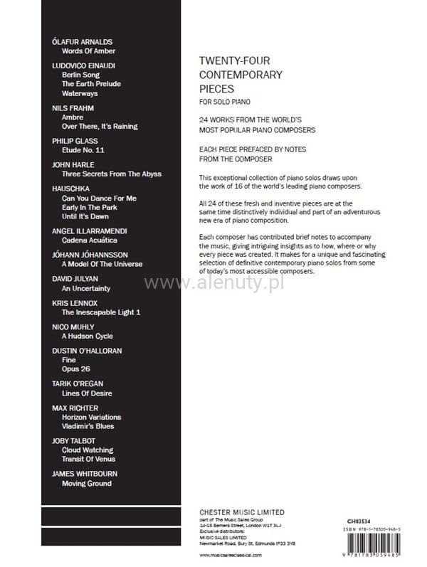 Wspaniała kolekcja 24 współczesnych utworów klasycznych, będących dziełami 16 największych światowych kompozytorów. Książka zawiera również ciekawe notatki każdego kompozytora, dotyczące ich muzyki.