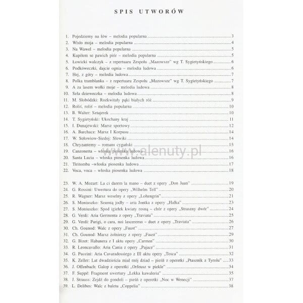 Publikacja zawiera utwory dla początkujących pianistów - to 65 łatwych kompozycji fortepianowych. Większość z nich stanowi opracowania znanych i lubianych dzieł takich twórców jak: Ogiński -Polonez Pożegnanie ojczyzny, Haendel - Largo, Grieg - Pieśń Solwejgi. Nuty dla poczatkujących.